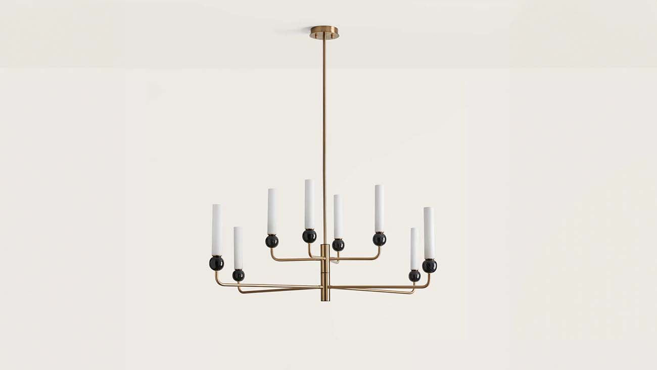 The Delie pendant light from the Spanish company Aromas del Campo is a beautiful and elegant chandelier that will refresh your interior with a unique style. The combination of a gold or black base gives the luminaire a refined look. The eight marble spheres that carry the light emitting cylinder create an original and luxurious design that will attract attention.