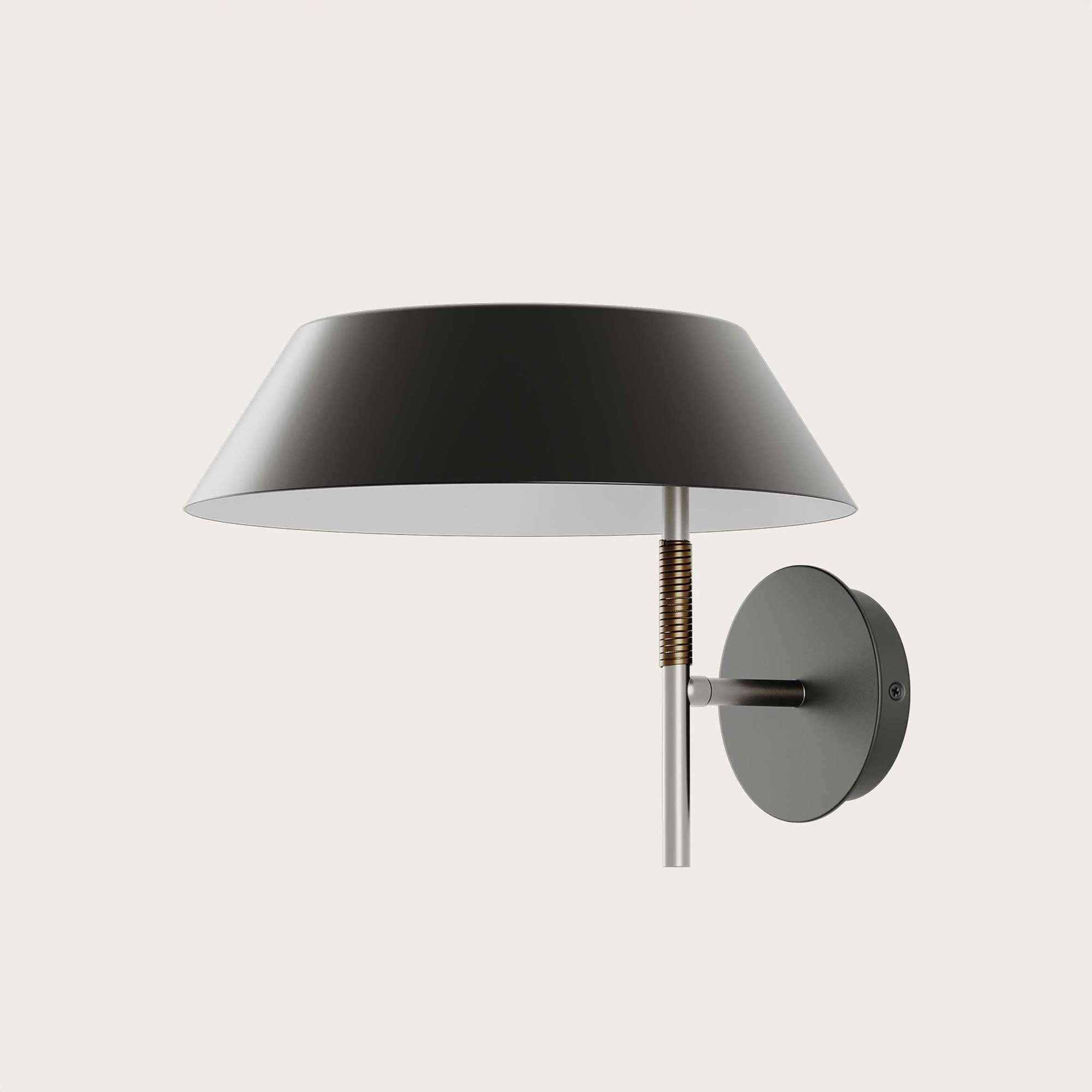 Nástenné svietidlo Aider od španielskej značky Aromas del Campo, ktoré navrhol Arnold Salido, nadväzuje na vizuálny štýl svojich stolových a stojacich variantov a prináša ho v kompaktnej podobe určenej na inštaláciu na stenu. Matný čierny kovový vrchnák vo farbe tienidla slúži ako držiak, z ktorého vyčnieva kovová tyč s jemným ratanovým detailom. Na jej konci je kónické tienidlo v matnej čiernej farbe s bielym vnútrom, ktoré zabezpečuje príjemné a rovnomerné rozptýlenie svetla. Svietidlo je vybavené päticou E27 a dodáva sa so stmievateľnou žiarovkou LED (9 W, 2700 K, 810 lm), ktorá vytvára teplé a útulné osvetlenie ideálne do spální, chodieb alebo obytných priestorov.