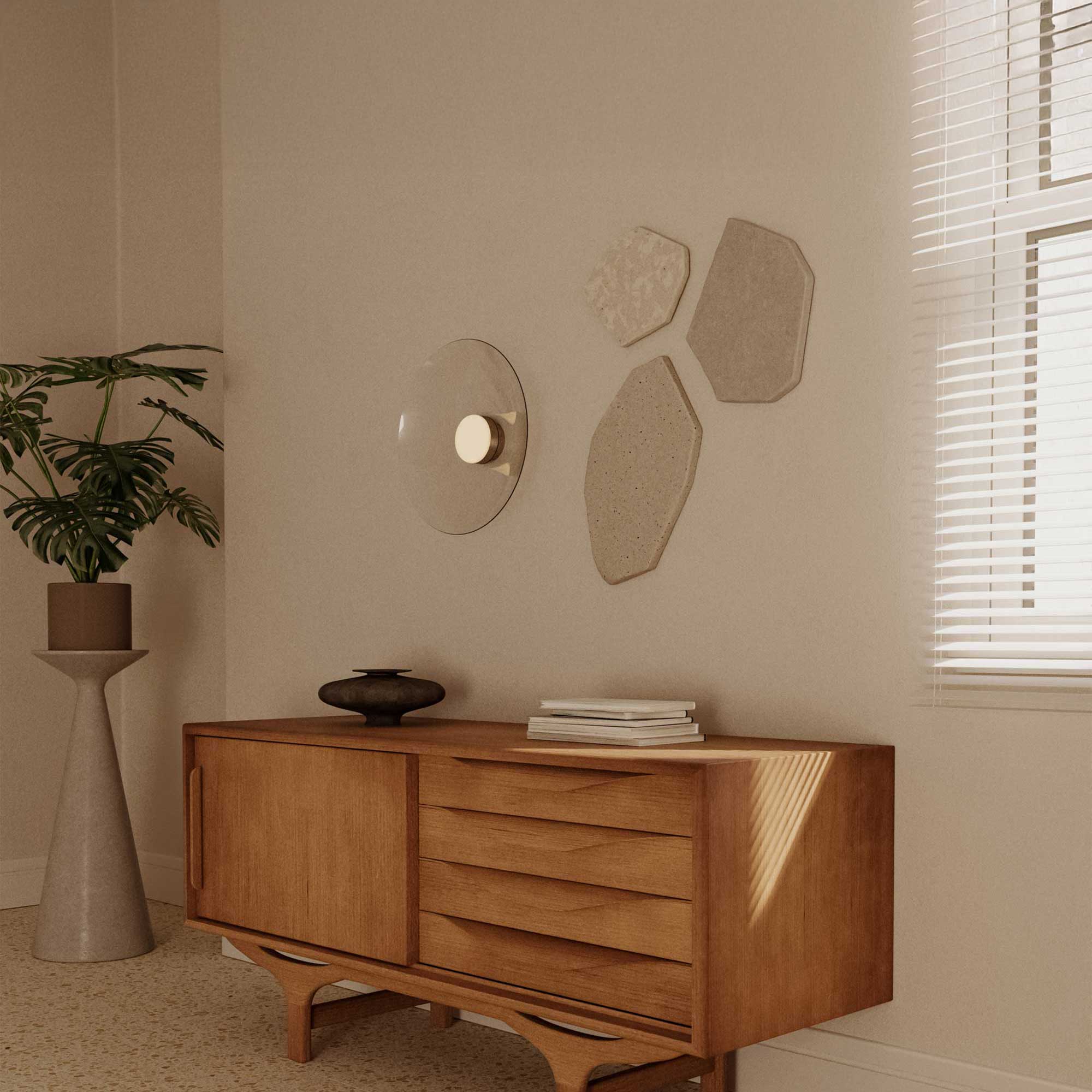 Nástenné svietidlo Betty od španielskej značky Aromas del Campo je elegantnou kombináciou kovu a číreho skla s čistým, minimalistickým dizajnom. Integrovaný 10 W LED zdroj s teplotou chromatickosti 2700 K a svetelným tokom 810 lm poskytuje príjemné, teplé svetlo. Svietidlo je vybavené stmievateľným ovládačom TRIAC umiestneným v rozete, ktorý umožňuje reguláciu intenzity svetla. Sklenený kruhový disk jemne odráža okolie a spolu s centrálnym svetelným bodom vytvára moderný a sofistikovaný prvok vhodný do obytných a komerčných priestorov.