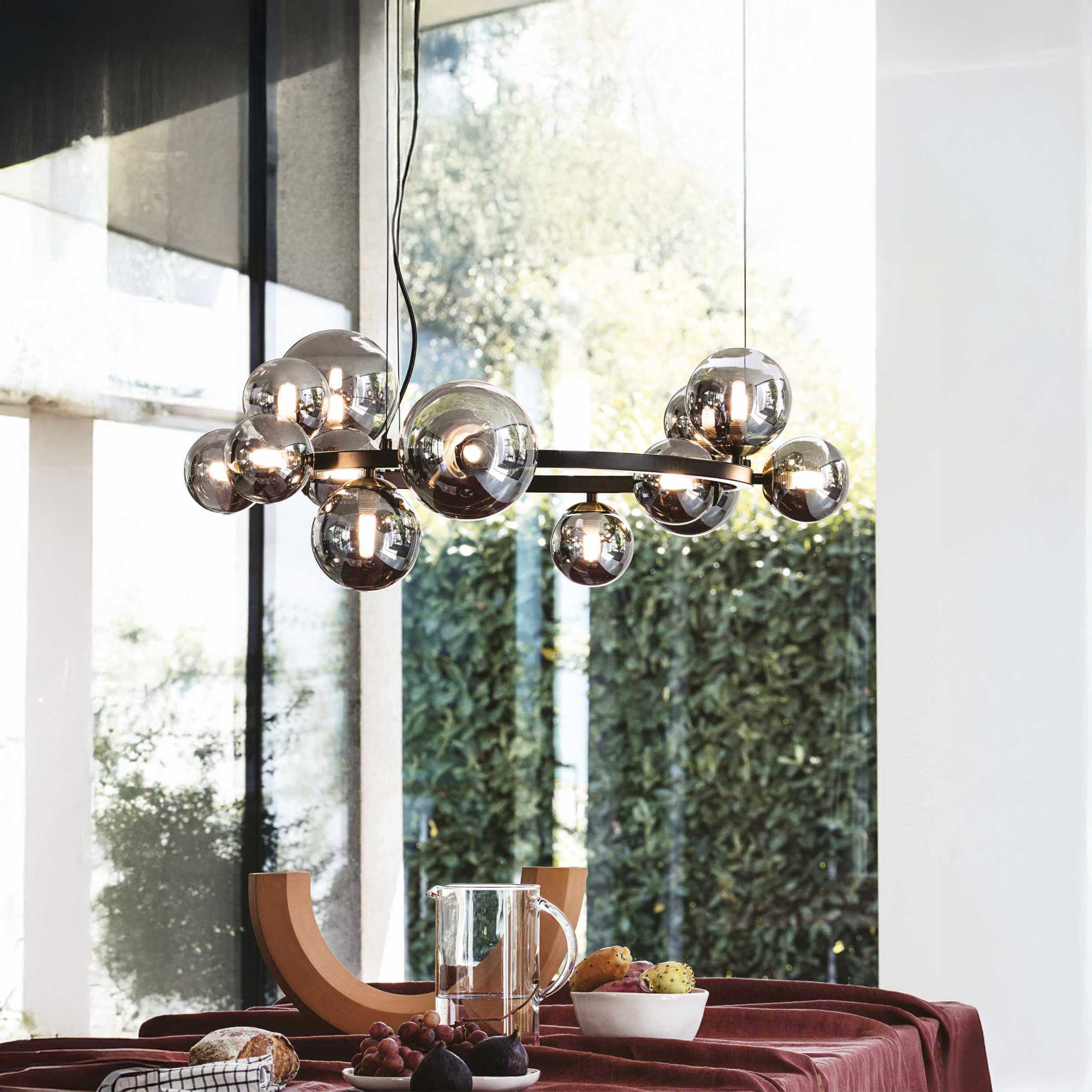 Závesné svietidlo Perlage od renomovaného talianskeho výrobcu Ideal Lux je elegantnou kombináciou moderného dizajnu a precízneho spracovania. Kruhová kovová konštrukcia doplnená difúzormi z ručne fúkaného skla zabezpečuje jemné a rovnomerné rozptýlenie svetla a zároveň dodáva svietidlu výrazný dekoratívny charakter.
